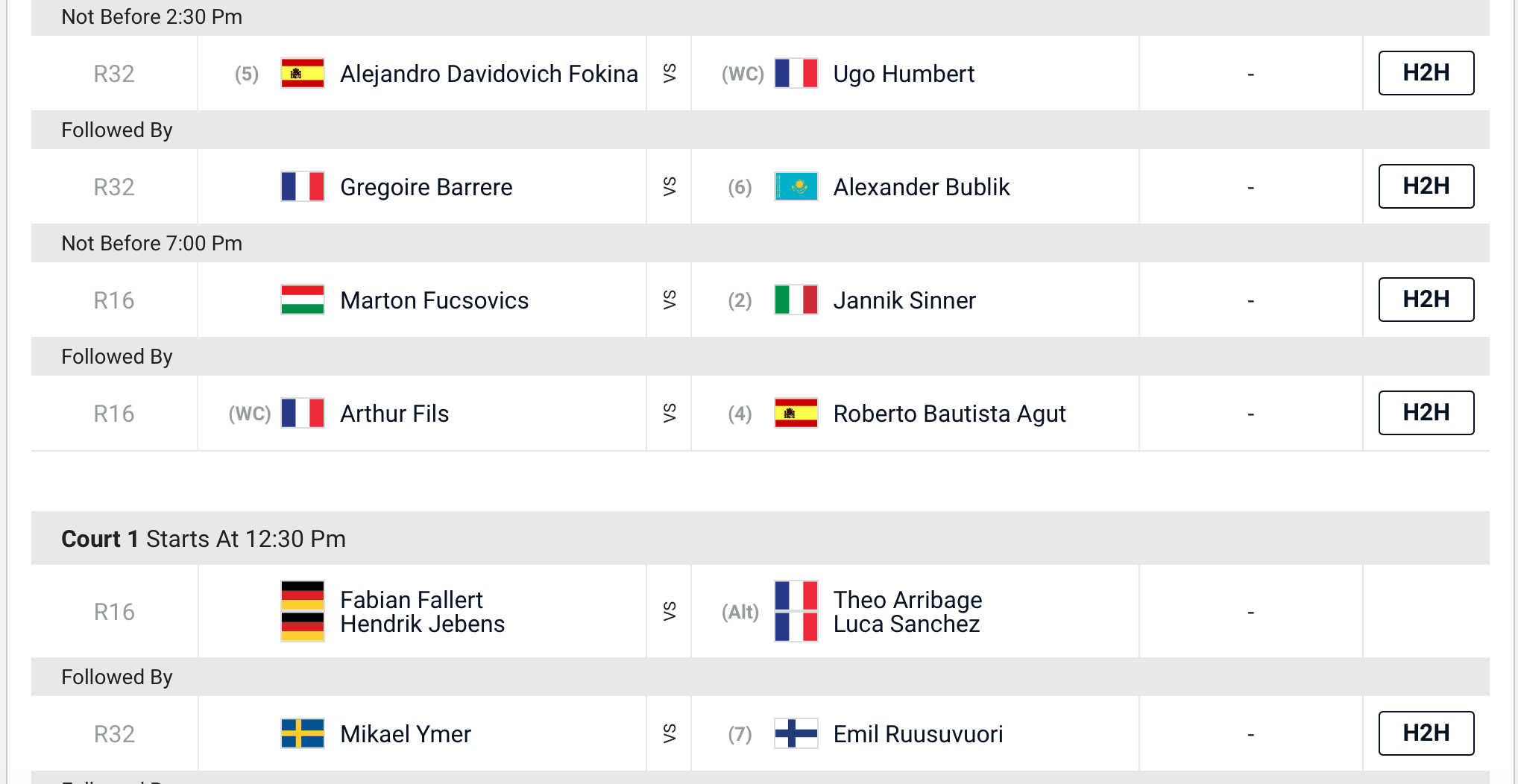 Sinner does have a tricky match, hopefully he can come through.Looking forward to watching more of young Arthur Fils, I think the experience of RBA will come through