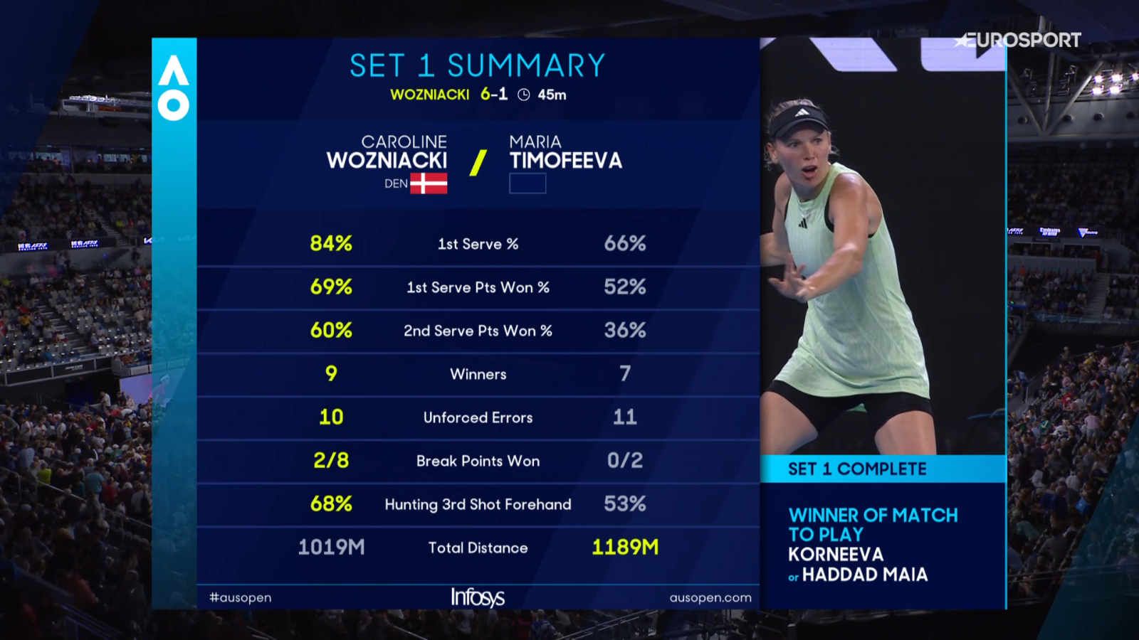 The youngster is making it tough for Caroline, she loves to play the ball one more time, thank goodness Caroline is a good athlete and is quick around the courtTough first set with Woz winning a breadstick - which doesn't tell anything about the tough play