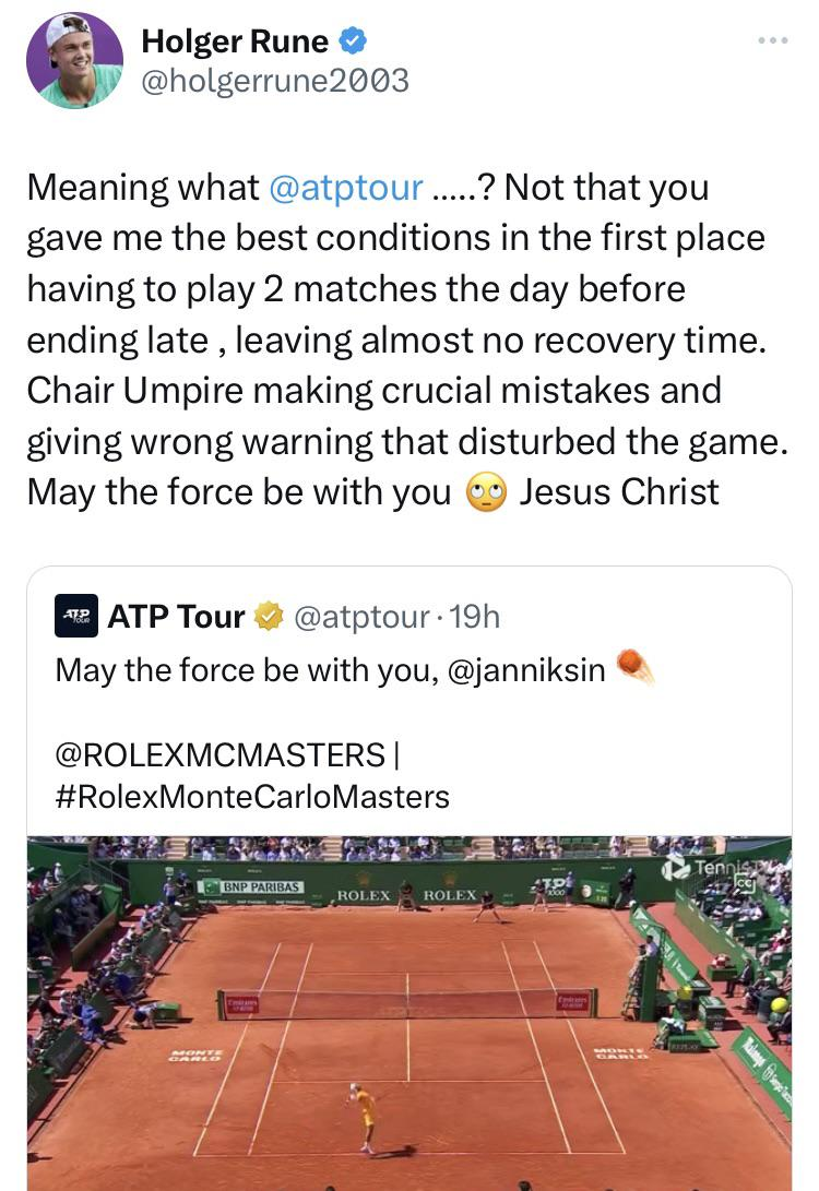 I am definitely not blind for Rune's faults. But in this case he is NOT making excuses for his loss with the comment. ATP wrote about Sinners victory and wrote "May the force be with you". And that is what he made the remarks too. And a lot of the comments I read on X got the message (and some didn't). And many agrees that it was uncalled for.