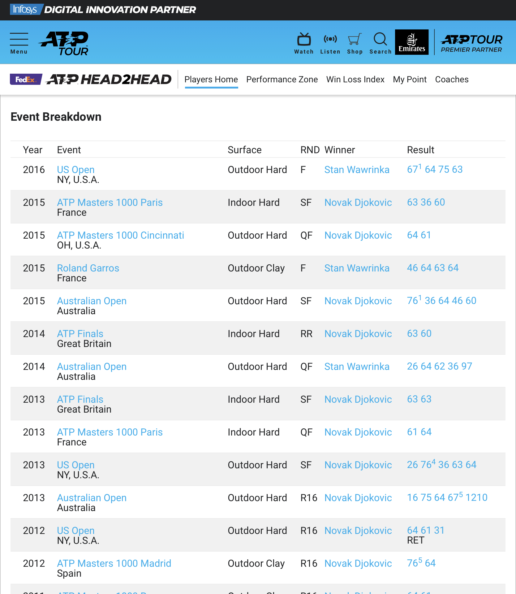 Well, me too, as I forgot about the other night, when Novak retired, but I got my intel from the ATP website, which had this graphic, which was clearly wrong, even before the last match was played. Still, I think you overstate the notion of "ownership" when the H2H is 19-6.I stand corrected. 4 out of 5 he has beaten him, last 3 pretty decisively.