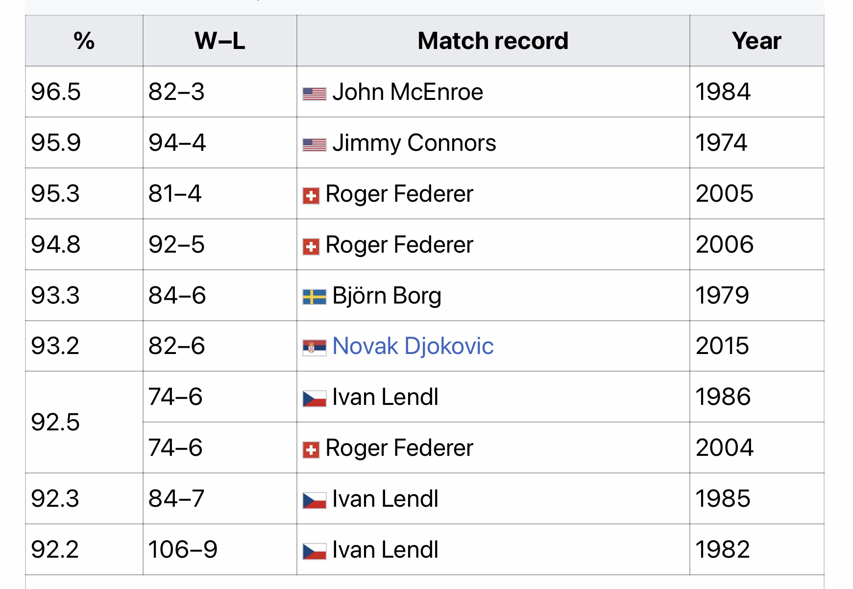 The GOAT talk about Federer didn’t take off just because he passed Agassi. It also reflected Roger’s incredible success in 2005/2006. He was barely losing matches: 81-4 (95.3%) in 2005, 92-5 (94.8%) in 2006 — still the third and fourth best winning percentages in a season in the entire Open Era.