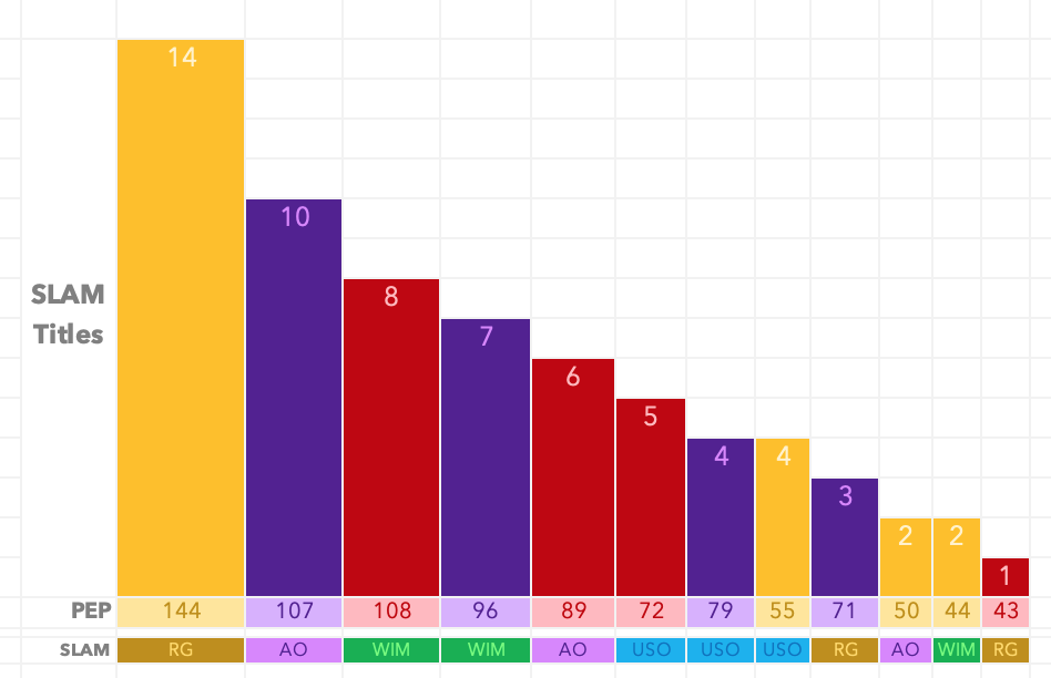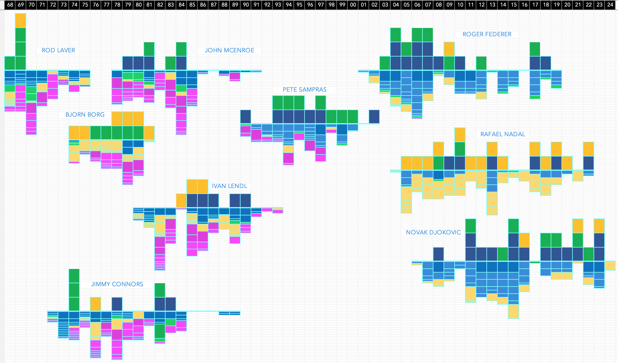 Explanation: Above the center line are Slams, below everything else. Slams are a darker color, with Tour Finals and Olympics medium and everything else lighter. Size correlates roughly with ATP points: one cell for ATP 250s, two cells for ATP 500s, four cells for Masters and Alt Finals, five cells for Olympics (except for '84, which is three cells), and Slams are eight cells.
