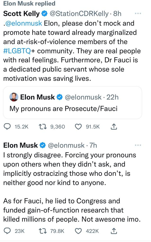 Obviously I agree with Elon regarding the pronouns thing. What was Fauci's lie? Obviously they got a number of things wrong, like masks at the start, but a bit harsh to call it a lie no? So what else were they lying about?