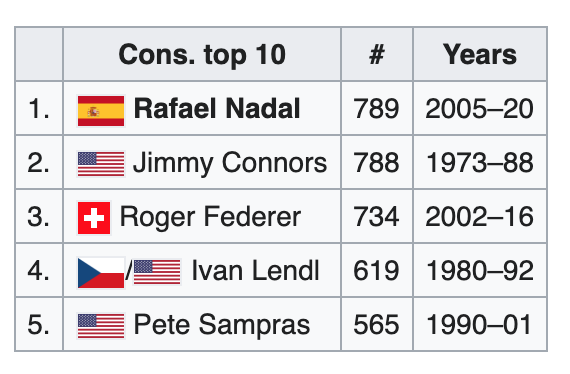 I just realized this today but Rafael Nadal has now the record for most consecutive weeks in the Top 10 with 789 consecutive weeks and counting. It is probably one of the most underrated records of Nadal's career.