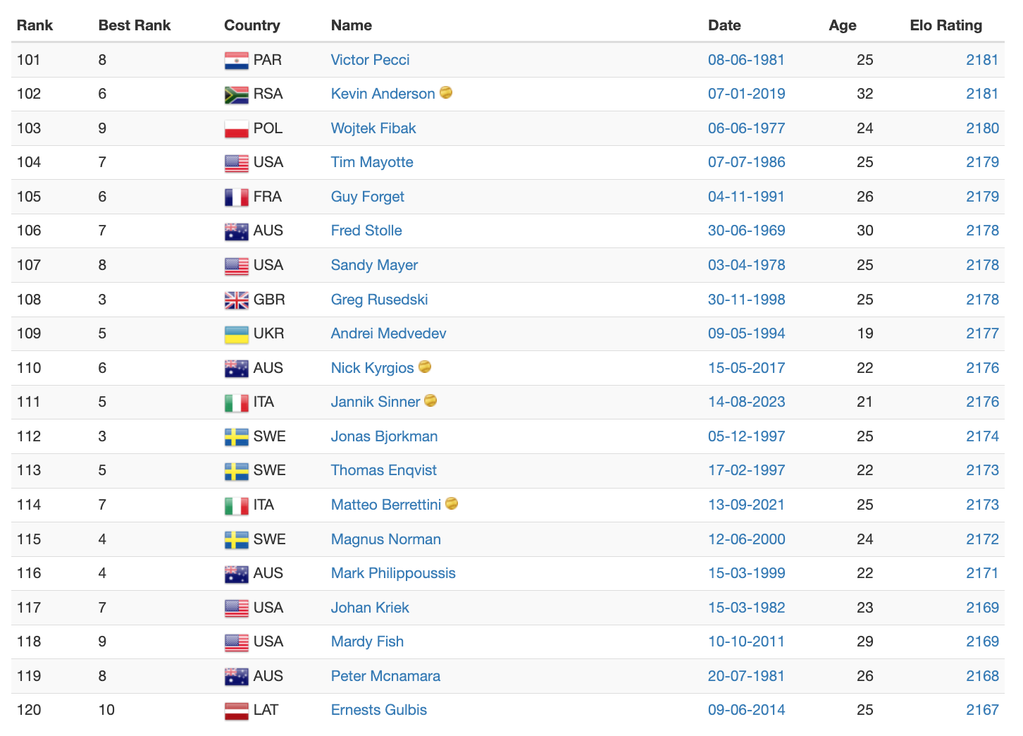 This doesn't mean that Sinner can't get better, just that it is rather unlikely that he'll get a ton better. As of now, I see his upside being more in the Medvedev-Zverev range - as a "tier 1.5" player...better than garden variety second tier players (e.g. Tsonga, Berdych) but never really the best player on tour (and yes, I realize that Daniil reached #1, but I don't think he was ever considered the best player on tour).