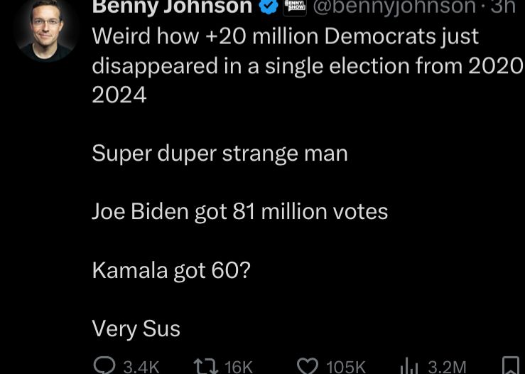 Biden was a careerist politician who was formerly vp. He was known. And a lot of people didn’t agree with you that he was a terrible candidate.That's not the reason. It's part of the reason but there's no way in hell 20 plus million NPCs changed ship. Biden was a terrible candidate too.