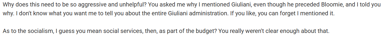 Why does this need to be so aggressive and unhelpful? You asked me why I mentioned Giuliani, even though he preceded Bloomie, and I told you why. I don't know what you want me to tell you about the entire Giuliani administration. If you like, you can forget I mentioned it.