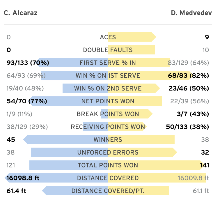 I can't remember when Medvedev played this good against the opponent that beat him easily 2 times this year. Really rised up to the occasion, he was all over the place chasing every ball, played so deep too, plus he had more highlight reel shots than Alcaraz. Really gutsy performance with a belief that he can win it.
