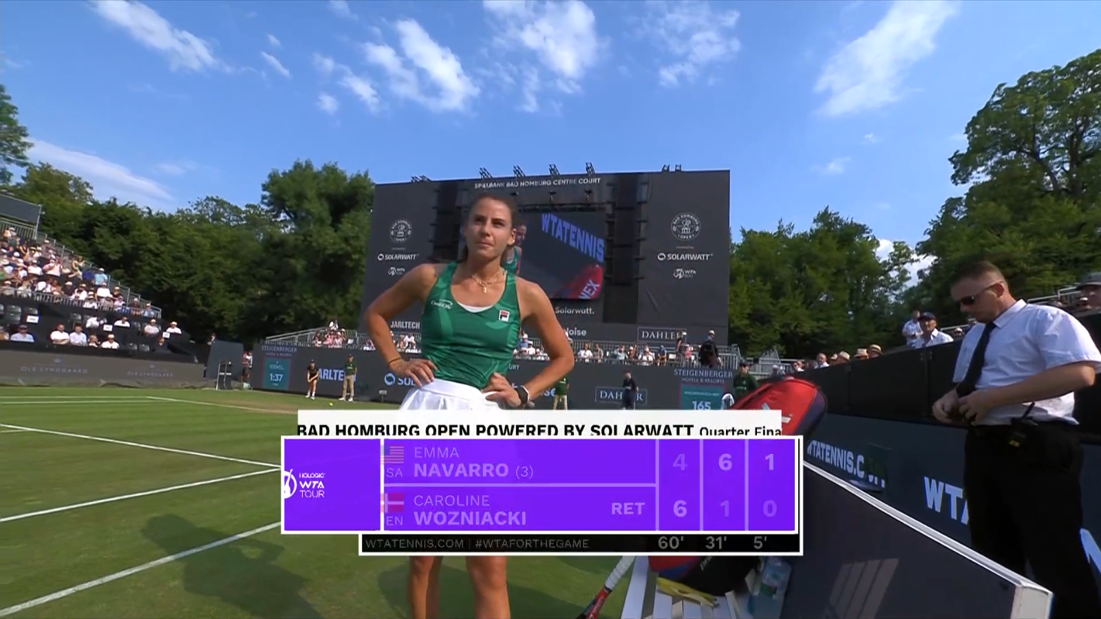 And as i predicted - second set was a different affair after Caros fall in first set. Second set 6-1 to Navarro. And Woz retired after first game in third set