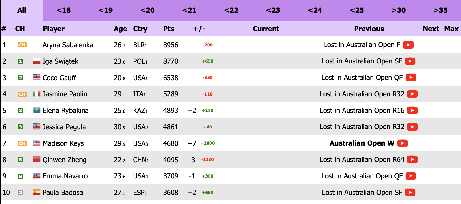 I have question marks on Rybakina and Pegula, Rybakina should have done better at the AO, seeing she was caught up in drama with her ex coach, and getting rid of Goran Ivanisevic after the AO, to me wasnt a good choice, I hope the drama she had in 2024. withdrawing from tournaments, getting sick dosent follow her in 2025, she is too good of a player, as she is back with her former coach who she sacked last year in Vukov, he still has to be cleared by WTA after allegations of abuse of Vukov against Rybakina. Pegula getting injured too much, lets see if she can stay in the top ten, I hope Madison can stay in the top ten now she has found her 'new confidence and mentality' and go forward for the rest of the year