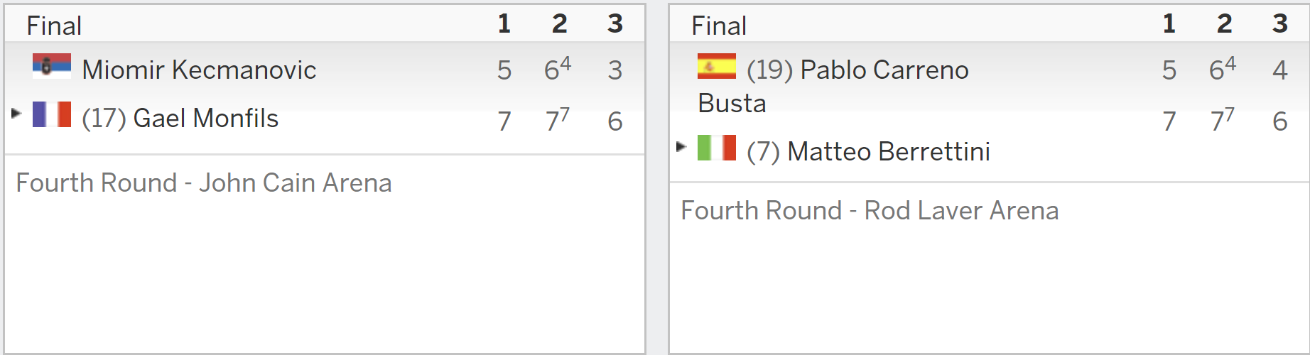 It’s interesting just how close the matches for the next round opponents almost mirror each other in score.Australian Open Results for Round 4 Day 7 - Sunday, January 23, 2022