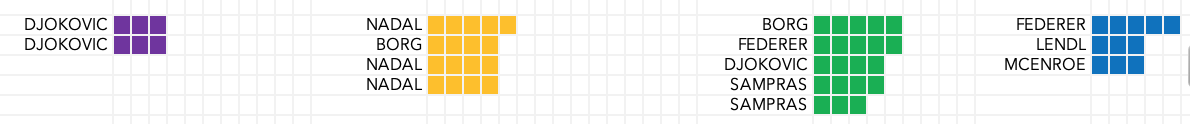Each has their own "shape" that tells a different story: Obviously Rafa's 14 RG titles. USO stands out for not having any player win more than five, and also more (6) with at least four. Wimbledon has a "Big Three" (four, if we account for Borg's short career). The AO has Novak doing a "semi-Rafa" and then more multi-Slam winners, with a lot of guys winning two.