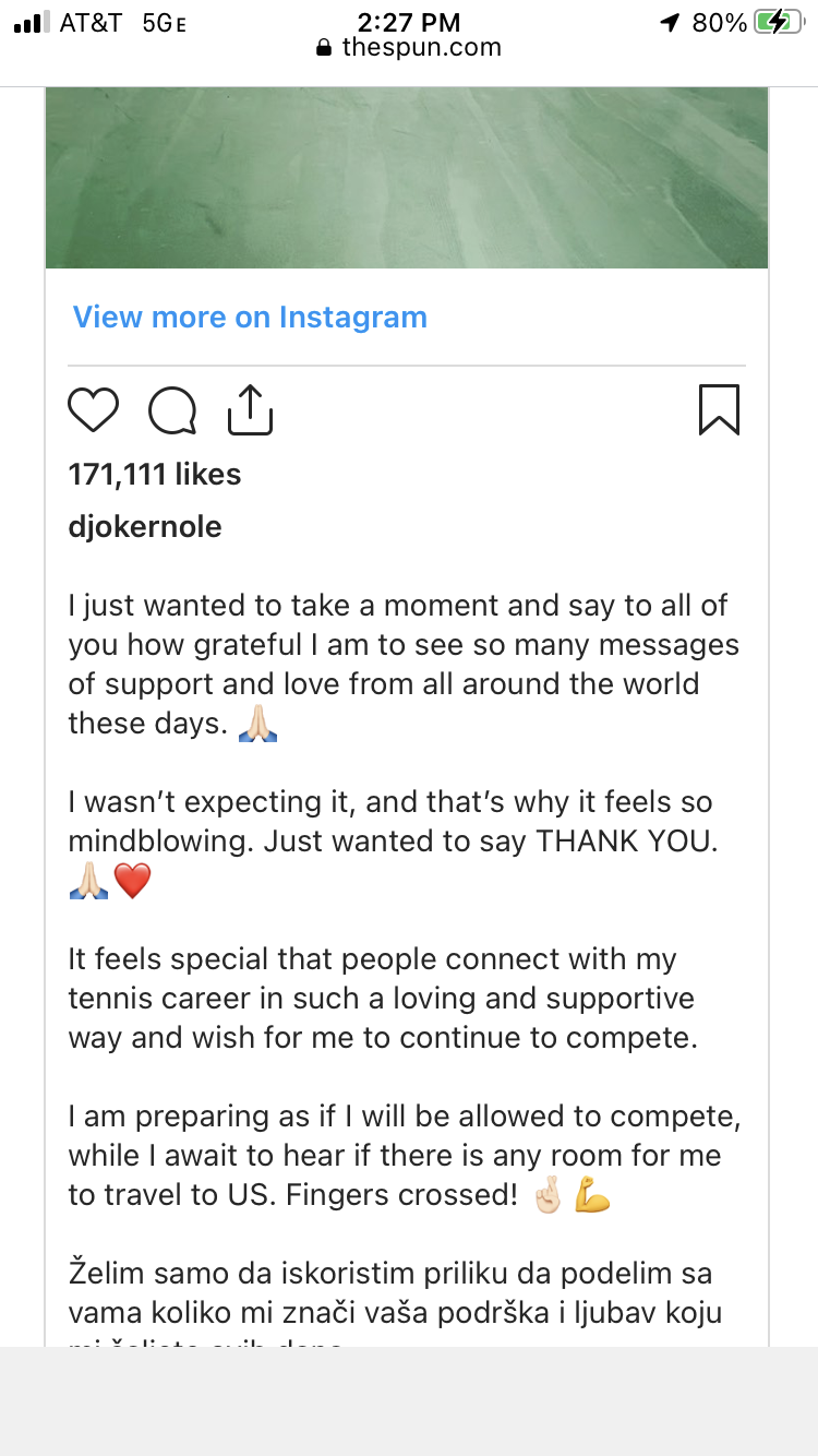 Thanks Kskate, I just read that on Novak's Instragram page, it was also on Twitter? honestly does he really think he will be allowed into the US? he has no intention of getting vaccinated, that is his choice, he has to understand that countries have their own strict COVID protocols in place. Maybe he should find a hobby while he cannot play tennis. I hear knitting is good for the soul :)