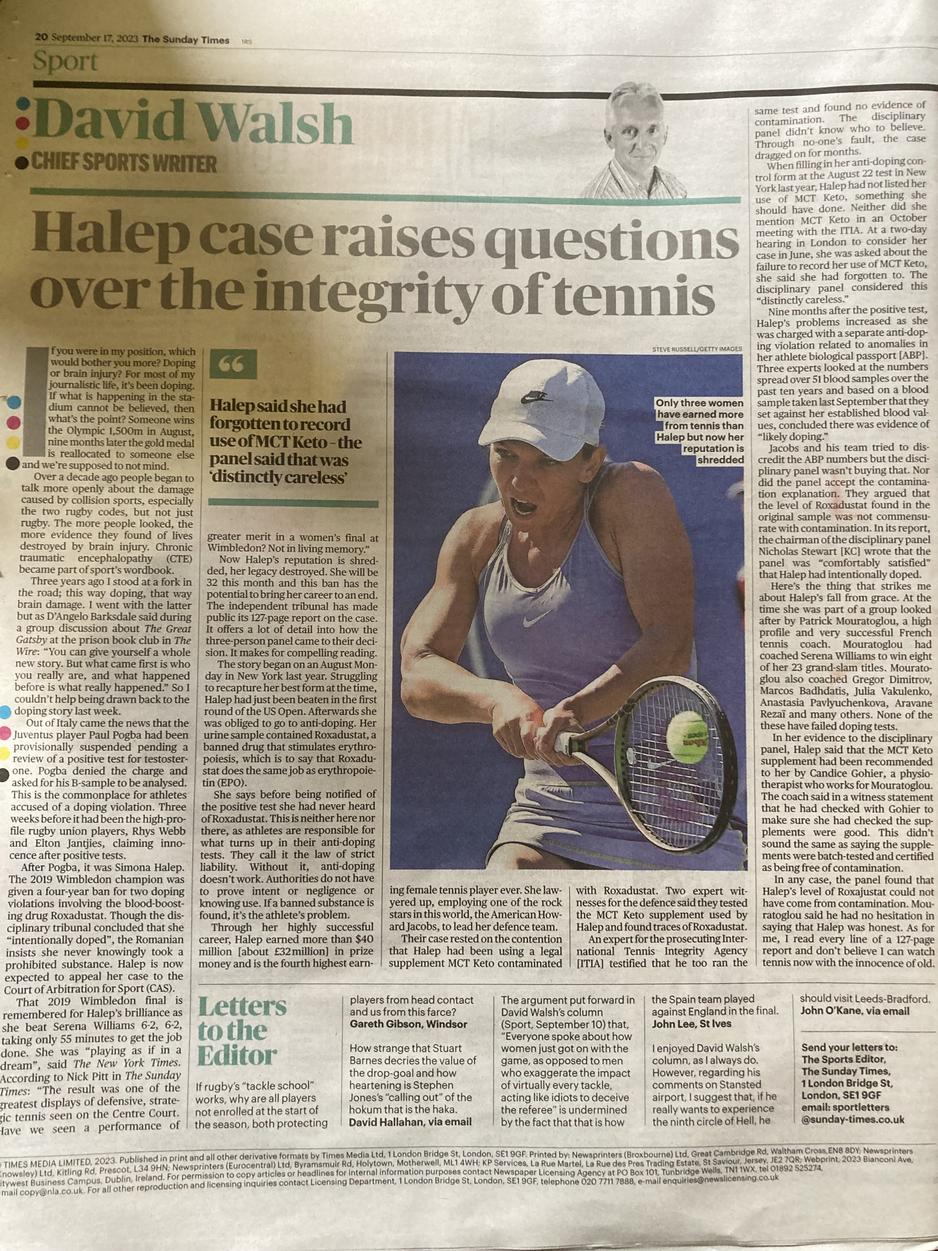 Eh, I don’t think so. She’s still responsible at every stage for what she consumes. This would be the defence of every drug cheat. It’s kind of like a cynical version of the Cough Drop defence posted by Cilic. I can believe Cilic, and I can believe that these things might accidentally happen. But the problem with what Patrick Mouthpiece is saying is that she’s victim, not a responsible adult at all. He’s in fact admits he’s at fault - “it’s basically me” - but don’t expect him to punish himself because he perceived it all to be an innocent mistake.The ITIA report that led to Halep's ban confirmed that physiotherapist Candice Gohier, who joined Halep's team in April 2022, was the person who recommended the collagen supplement.Now Patrick Mouratoglou has made a statement on the incident and admitted his team have taken responsibility for giving Halep collagen that was contaminated with a banned substance.