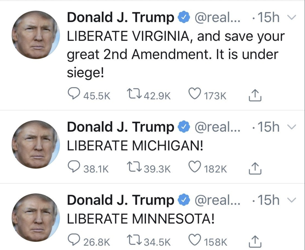 And no doubt they'll be out in force denying Trump has any culpability if anything should happen because of these tweets. And bear in mind this is within 24hrs of telling governors that it was their decision about when to re-open. So let's pin them here shall we?